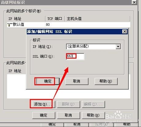 2.在“此网站多个SSL标识”处点击“添加”,并输入SSL端口为:443,并确定完成(默认服务器自带该设置,可跳过此步骤,没有的话可以添加)。